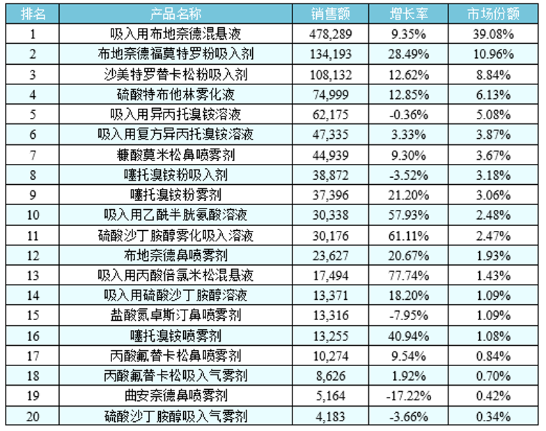 中國市場(chǎng)呈現(xiàn)不同的情況,據(jù)中國城市公立醫(yī)院統(tǒng)計(jì),2018年呼吸系統(tǒng)用藥之氣霧劑、噴霧劑與粉霧劑產(chǎn)品名稱TOP20格局(下表所示)中霧化溶液占62%的市場(chǎng),粉霧劑占25%,氣霧劑只占2%不到,說明中國吸入制劑市場(chǎng)具有其內(nèi)在的特點(diǎn),其中霧化吸入溶液代表產(chǎn)品在國內(nèi)均呈增長趨勢(shì)。