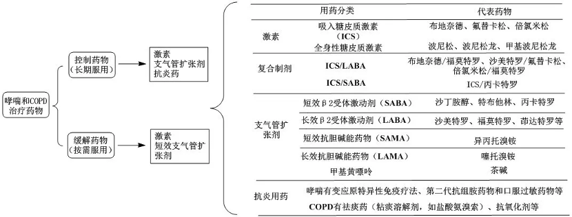 中國及歐美上市治療哮喘和慢性阻塞性肺病的藥物類別主要有:長/短效β2受體激動(dòng)劑藥物 、長/短效抗膽堿能藥物、糖皮質(zhì)激素、白三烯受體拮抗劑、細(xì)胞因子抑制劑等。