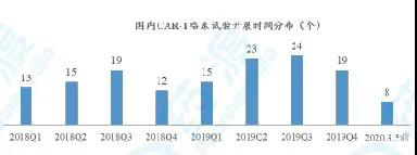 我們對(duì)Clinicaltrials.gov數(shù)據(jù)庫(kù)導(dǎo)出的148個(gè)CAR-T臨床試驗(yàn)進(jìn)行了整理分析,2018年至今正式開展的臨床試驗(yàn)個(gè)數(shù)時(shí)間分布見下圖。