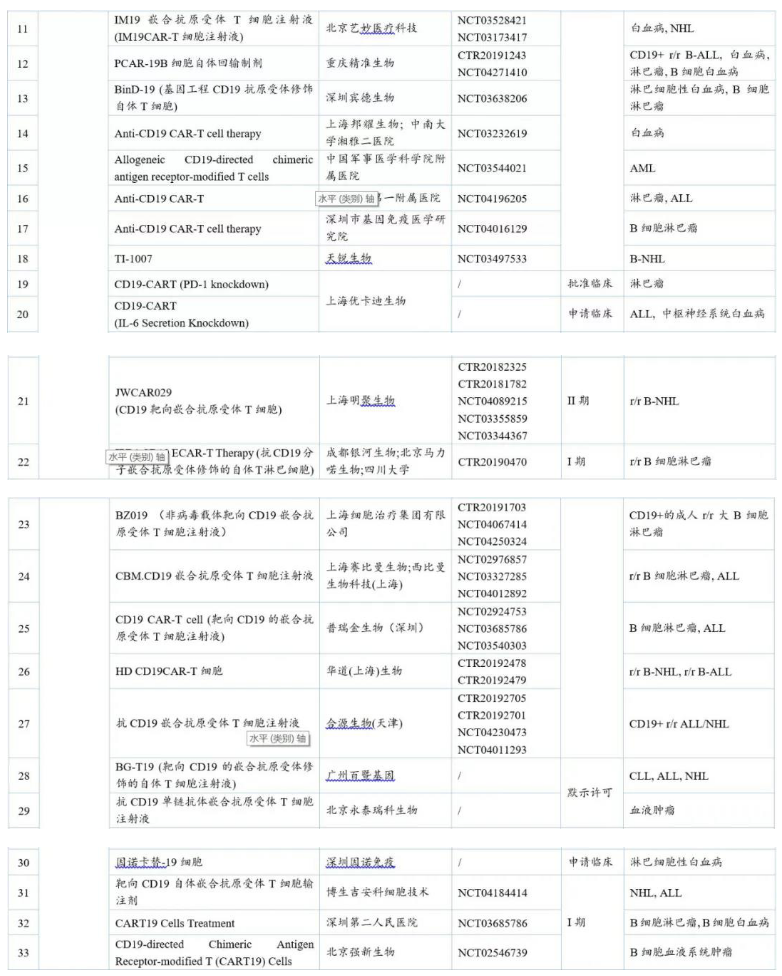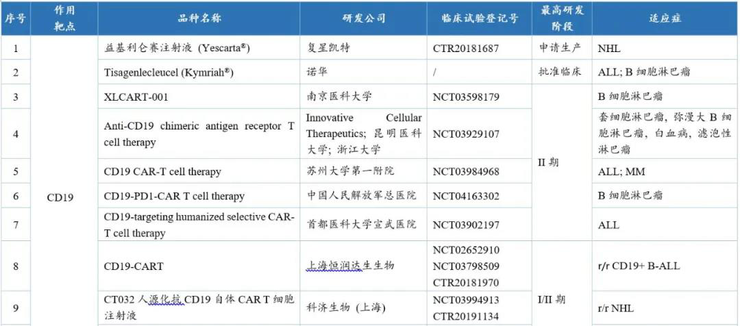 國(guó)內(nèi)針對(duì)CD19的CAR-T品種多達(dá)50余個(gè),其中進(jìn)展最快的是國(guó)外已上市的Yescarta®,國(guó)內(nèi)暫定名為益基利侖賽注射液,目前已在國(guó)內(nèi)申請(qǐng)上市。此外,有5個(gè)中國(guó)1類品種處于臨床II期。