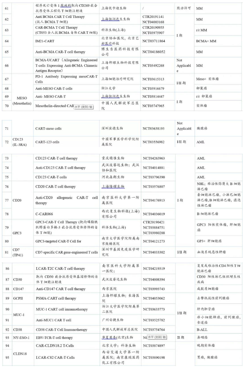 由上表可知,在開發(fā)靶點(diǎn)中,研究最多的是治療血液瘤的靶向CD19的品種,其次是治療實(shí)體瘤的靶向BCMA和Mesothelin的品種。