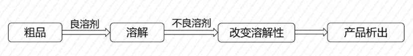 將粗品溶于溶解性好的溶劑(良溶劑)中,然后滴加溶解性不好的溶劑(不良溶劑),通過(guò)改變?nèi)莘e比例,進(jìn)而改變?nèi)軇w系對(duì)產(chǎn)品的溶解性,讓產(chǎn)品析出。