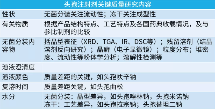2)頭孢注射劑關(guān)鍵質(zhì)量研究?jī)?nèi)容