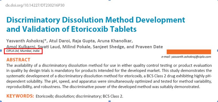 2016年,印度同仁對溶出度技術(shù)的運(yùn)用已日趨成熟,開始公開撰文。《溶出度試驗技術(shù)雜志(DissolutionTechnologies)》在該年5月發(fā)表了一篇由印度CIPLA公司研發(fā)人員撰寫的“以依托考昔片為例:如何開發(fā)適度區(qū)分力的溶出方法”文章。