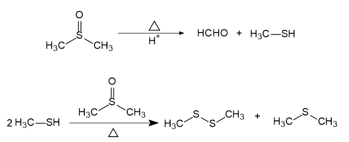 查詢二甲基亞砜穩(wěn)定性相關文獻,報道二甲基亞砜在酸性條件下高溫加熱會發(fā)生分解,分解產物主要是甲硫醚(沸點38℃)、二甲基二硫醚(沸點109℃)和甲硫醇(沸點123℃)。