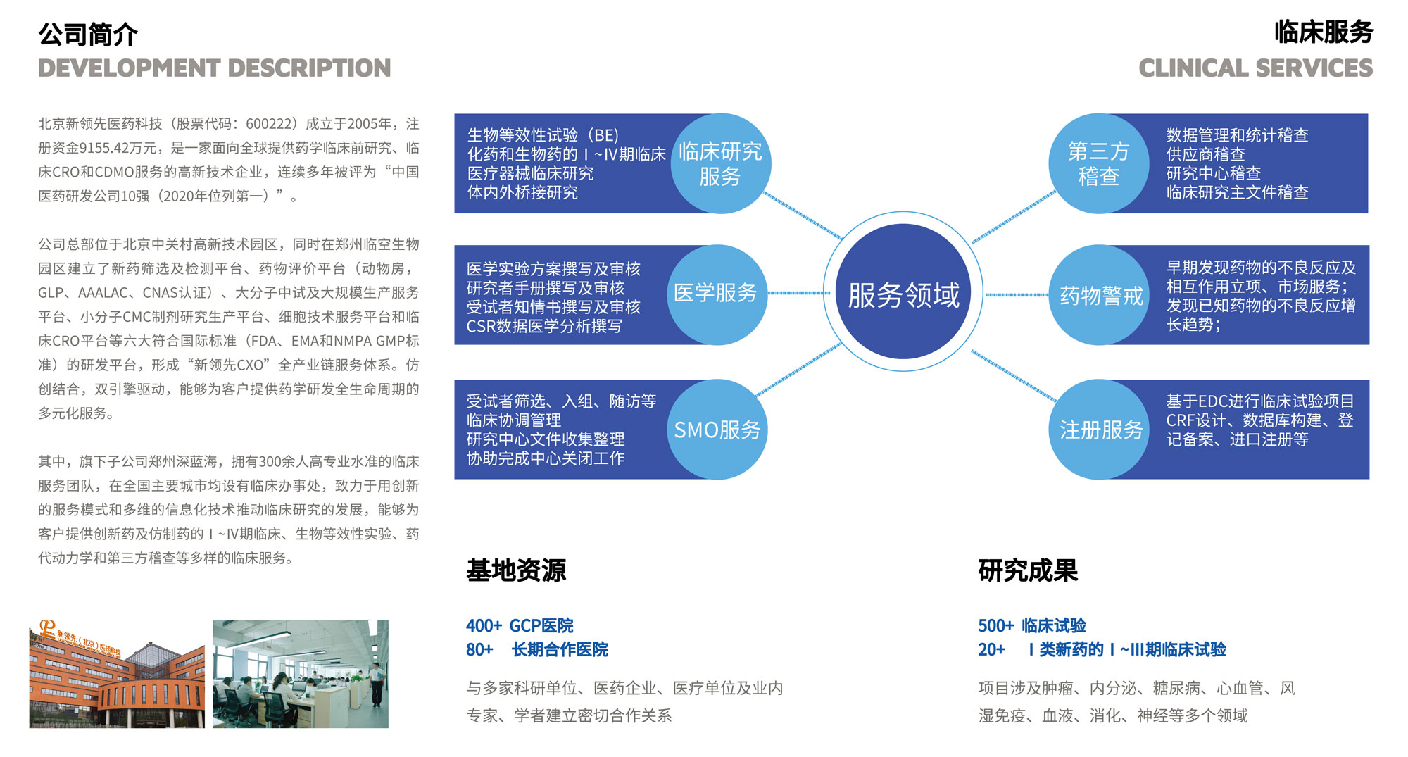 北京新領先(股票代碼:600222)成立于2005年,注冊資金9155.42萬元,是一家面向全球提供藥學臨床前研究、臨床CRO和CDMO服務的高新技術企業(yè),連續(xù)多年被評為“中國醫(yī)藥研發(fā)公司10強(2020年位列第一)”。公司總部位于北京中關村高新技術園區(qū),同時在鄭州臨空生物園區(qū)建立了新藥篩選及檢測平臺、藥物評價平臺(動物房,GLP、AAALAC、CNAS認證)、大分子中試及大規(guī)模生產服務平臺、小分子CMC制劑研究生產平臺、細胞技術服務平臺和臨床CRO平臺等六大符合國際標準(FDA、EMA和NMPA GMP標準)的研發(fā)平臺,形成“新領先CXO”全產業(yè)鏈服務體系。仿創(chuàng)結合,雙引擎驅動,能夠為客戶提供藥學研發(fā)全生命周期的多元化服務。