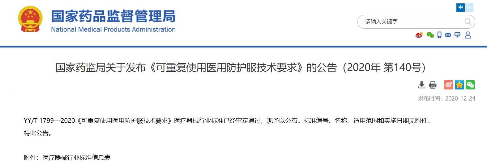關(guān)于發(fā)布《可重復(fù)使用醫(yī)用防護服技術(shù)要求》的公告(2020年第140號)