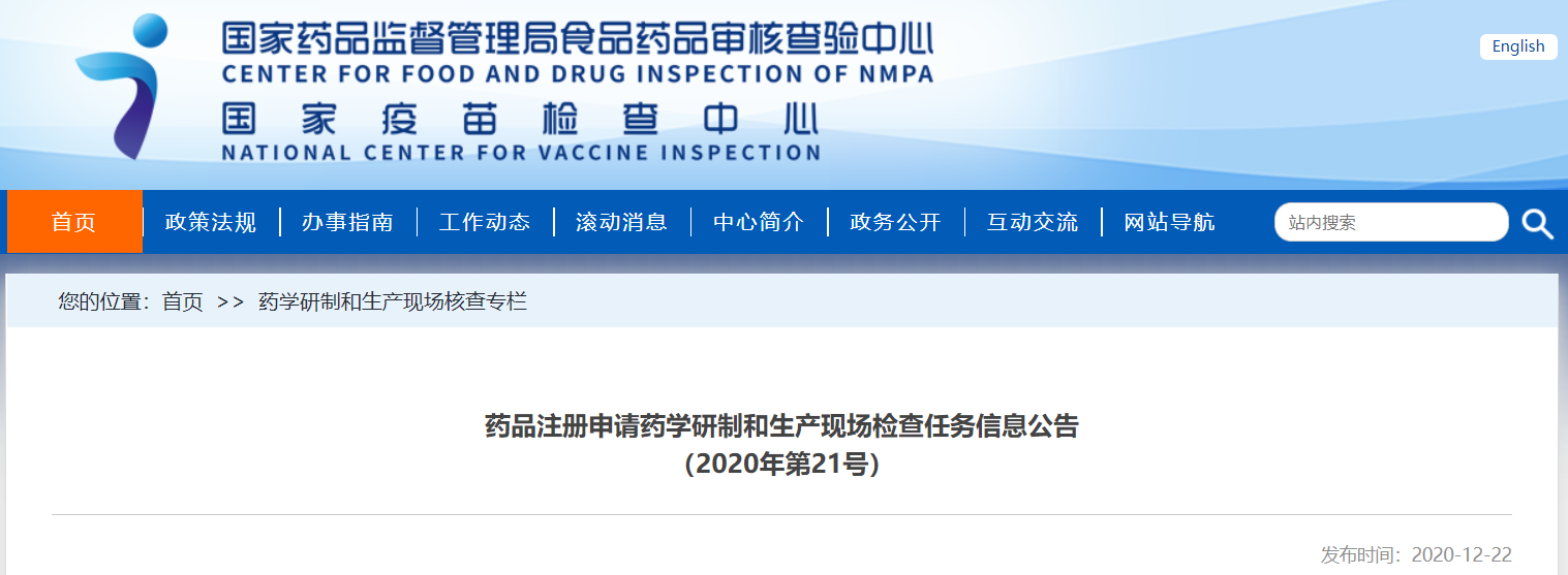 藥品注冊申請藥學(xué)研制和生產(chǎn)現(xiàn)場檢查任務(wù)信息公告(2020年第21號)