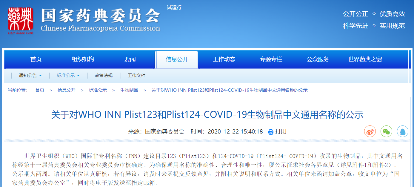 關(guān)于對WHO INN Plist123和Plist124-COVID-19生物制品中文通用名稱的公示