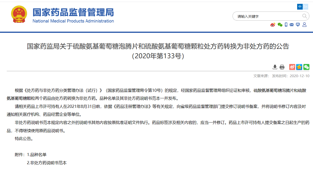 關(guān)于硫酸氨基葡萄糖泡騰片和硫酸氨基葡萄糖顆粒處方藥轉(zhuǎn)換為非處方藥的公告(2020年第133號)