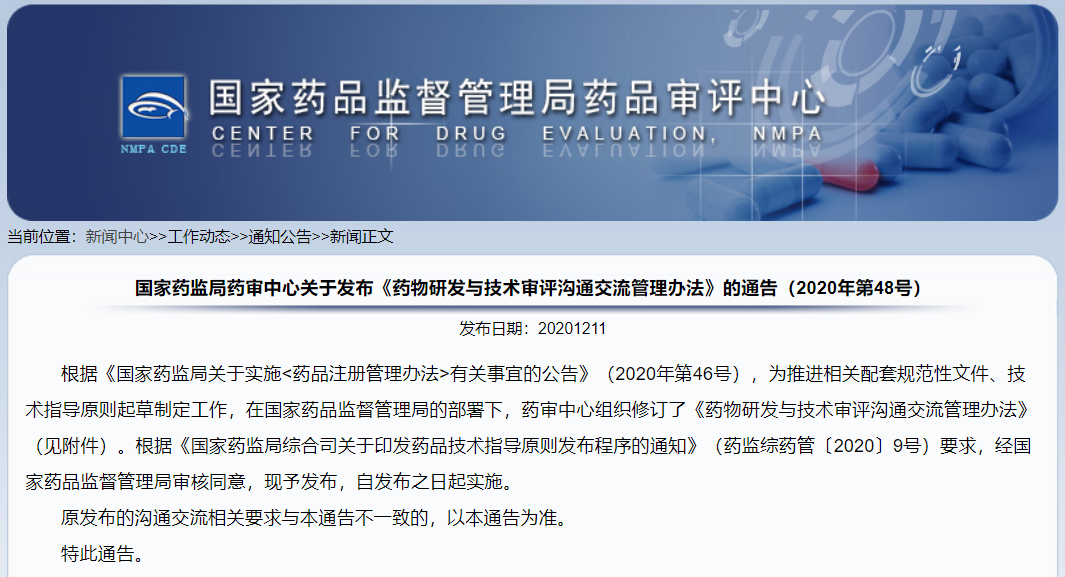 關(guān)于發(fā)布《藥物研發(fā)與技術(shù)審評溝通交流管理辦法》的通告(2020年第48號)