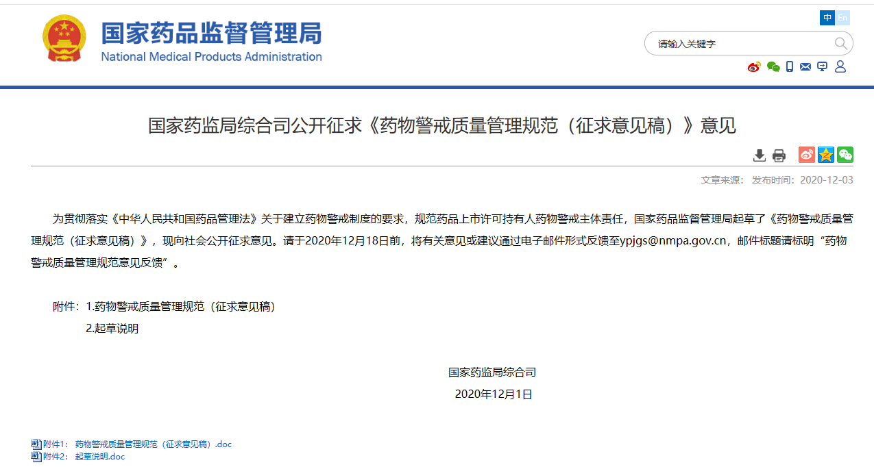 規(guī)范藥品上市許可持有人藥物警戒主體責(zé)任,國(guó)家藥品監(jiān)督管理局起草了《藥物警戒質(zhì)量管理規(guī)范(征求意見(jiàn)稿)》,.適用于藥品的非臨床研究、臨床試驗(yàn)、生產(chǎn)經(jīng)營(yíng)、上市后研究、不良反應(yīng)監(jiān)測(cè)及報(bào)告與處理等,現(xiàn)向社會(huì)公開(kāi)征求意見(jiàn),時(shí)間截止至2020.12.28。