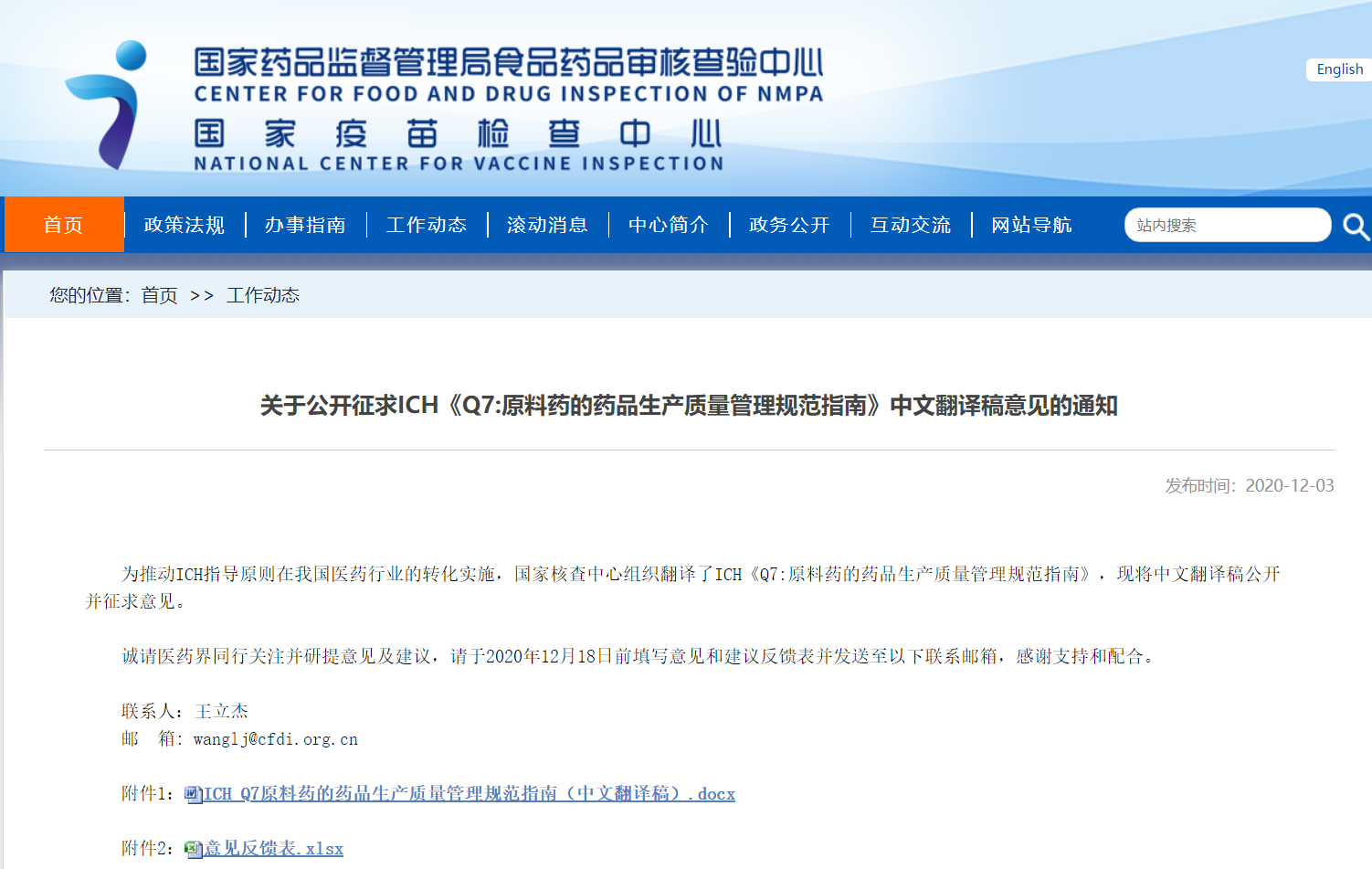 關(guān)于公開(kāi)征求ICH《Q7:原料藥的藥品生產(chǎn)質(zhì)量管理規(guī)范指南》中文翻譯稿意見(jiàn)的通知