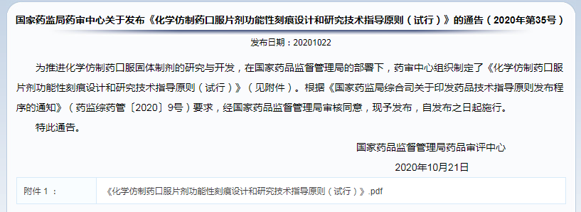 ? 國家藥監(jiān)局藥審中心關于發(fā)布《化學仿制藥口服片劑功能性刻痕設計和研究技術指導原則(試行)》的通告(2020年第35號)