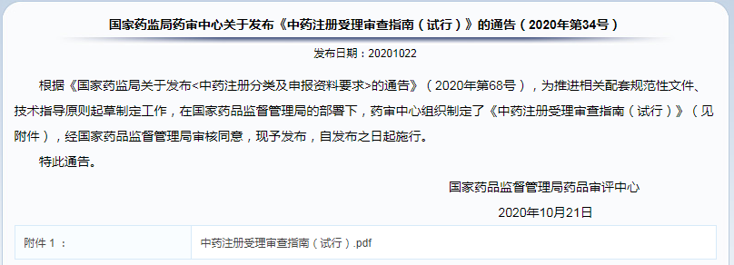? 國家藥監(jiān)局藥審中心關于發(fā)布《中藥注冊受理審查指南(試行)》的通告(2020年第34號)