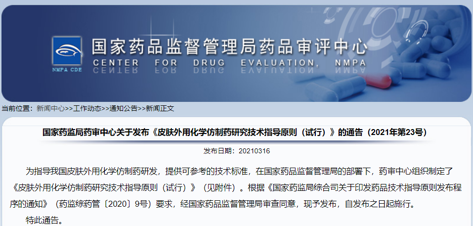 關(guān)于發(fā)布《皮膚外用化學(xué)仿制藥研究技術(shù)指導(dǎo)原則(試行)》的通告(2021年第23號(hào))