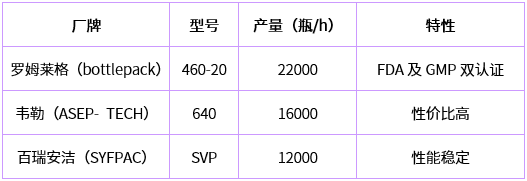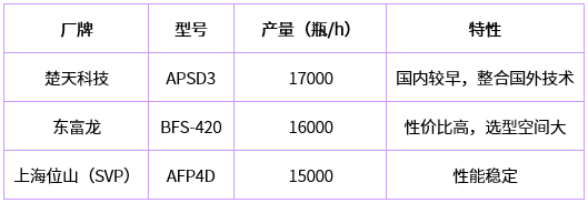國內生產BFS線的制造商主要有楚天科技、上海東富龍、上海位山等。主要型號及生產能力如下表所示(以2~5ml灌裝量為例):