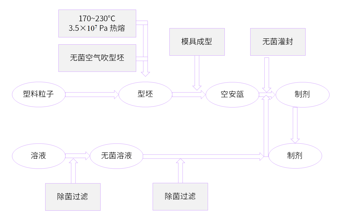 通過以上介紹表明,BFS技術在無菌保證方面總體上比傳統(tǒng)洗灌封工藝優(yōu)勢明顯,為了保障整個生產工藝的無菌水平,還需要與BFS生產線配套的重要設施和設備,BFS生產流程示意圖如下: