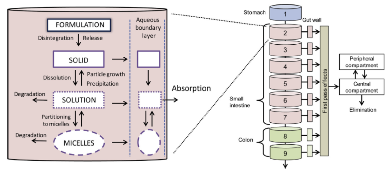 綜上所述,藥物的口服吸收取決于藥物API的溶解度、粒徑、晶型、滲透性和輔料的性質以及人體胃腸道的生理學特性和食物攝取情況等等因素。這其中的每個因素都影響藥物的釋放,吸收和藥代動力學性質。在藥物研發(fā)過程中,一般采用體外溶出實驗獲取溶出數(shù)據(jù),后使用Gastroplus軟件進行以生理學為基礎的藥代動力學(PBPK)建模,對藥物的吸收情況進行評價預測。