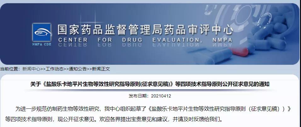 關(guān)于《鹽酸樂卡地平片生物等效性研究指導(dǎo)原則(征求意見稿)》等四項(xiàng)技術(shù)指導(dǎo)原則公開征求意見的通知