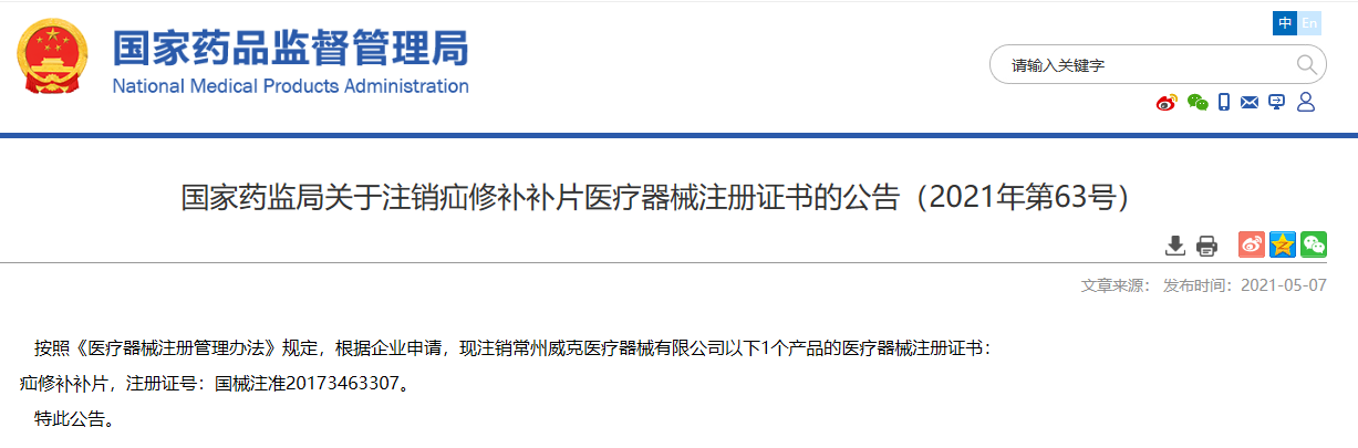 關(guān)于注銷疝修補(bǔ)補(bǔ)片醫(yī)療器械注冊(cè)證書的公告(2021年第63號(hào))