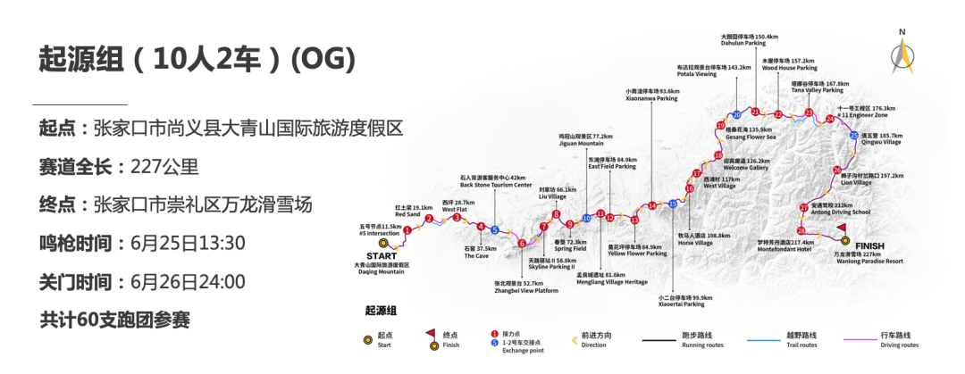 今年的比賽共設(shè)3個組別:10人2車起源組:起點為尚義縣大青山國際旅游度假區(qū),終點為崇禮區(qū)萬龍滑雪場,賽道總里程為227公里,鳴槍時間為6月25日13:30,關(guān)門時間為6月26日24:00。起源組共計60支跑團(tuán)參賽,相比2020年提升了20支跑團(tuán)。