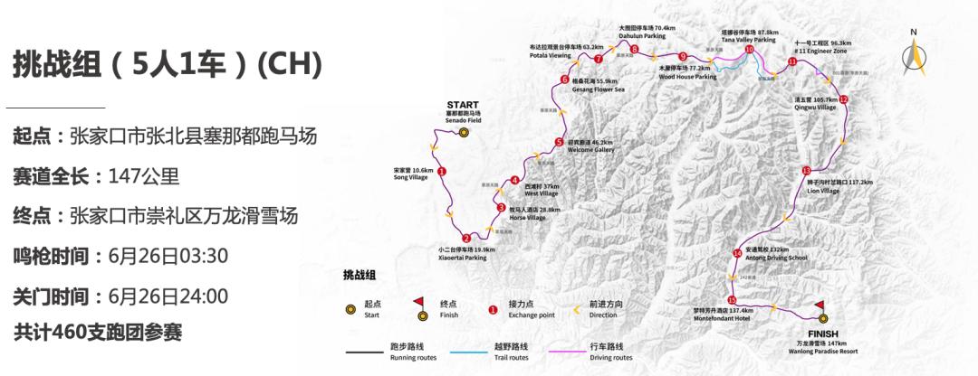 5人1車挑戰(zhàn)組:起點為張北縣塞那都跑馬場,終點為崇禮區(qū)萬龍滑雪場,賽道總里程為147公里,鳴槍時間為6月26日03:30,關(guān)門時間為6月26日24:00。挑戰(zhàn)組共計460支跑團(tuán)參賽,相比2020年提升了60支跑團(tuán)。