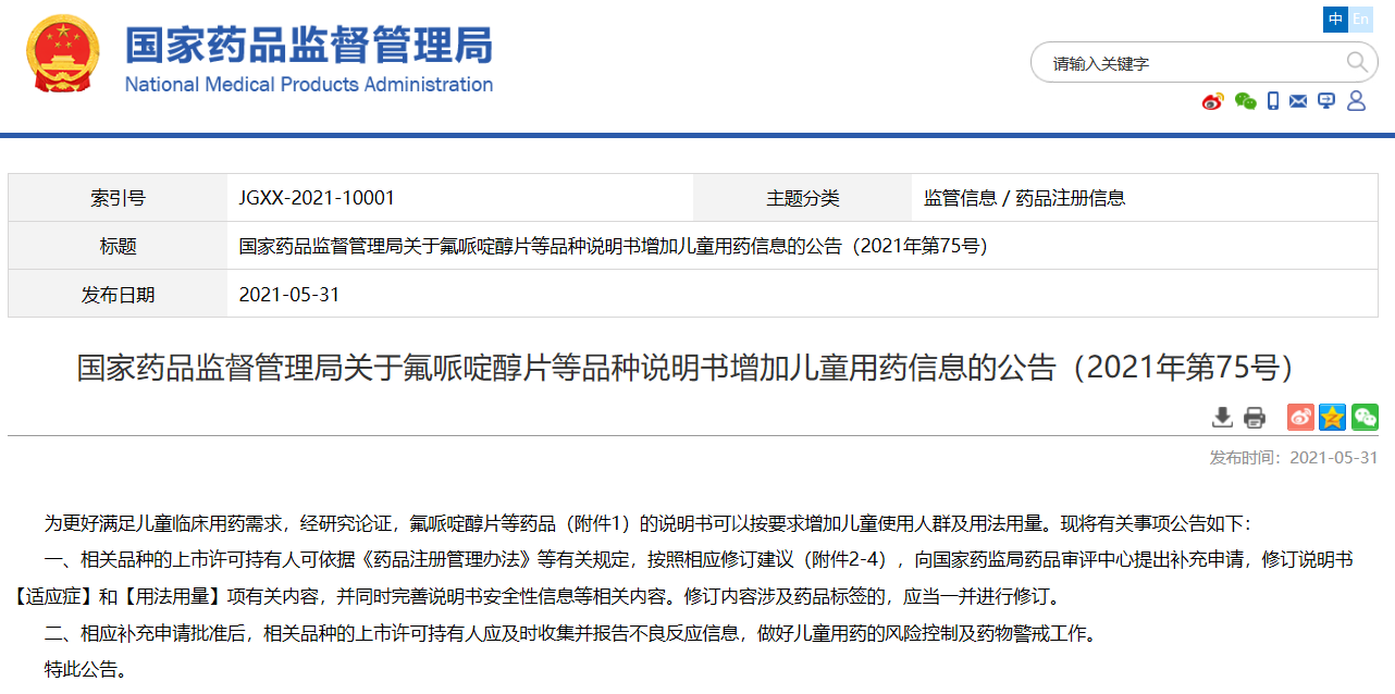 國(guó)家藥品監(jiān)督管理局關(guān)于氟哌啶醇片等品種說(shuō)明書(shū)增加兒童用藥信息的公告(2021年第75號(hào))