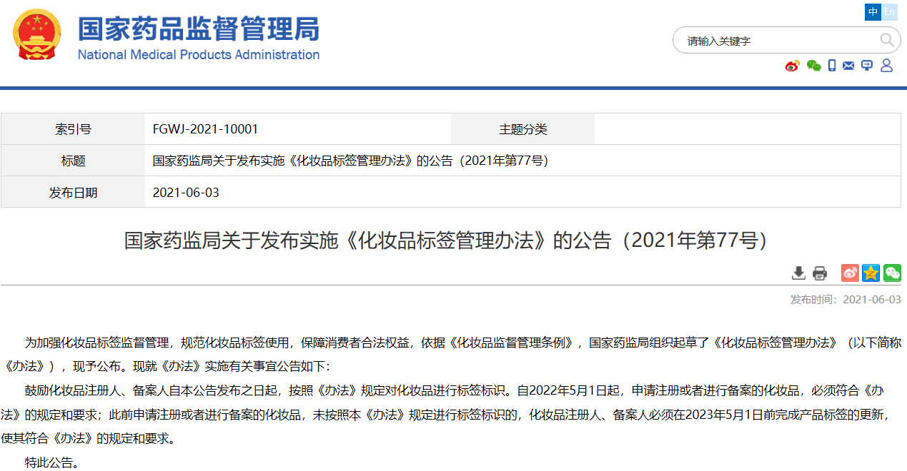 國(guó)家藥監(jiān)局關(guān)于發(fā)布實(shí)施《化妝品標(biāo)簽管理辦法》的公告(2021年第77號(hào))