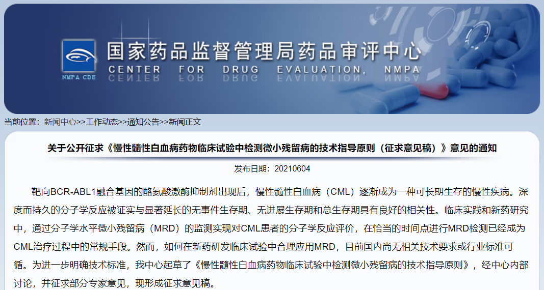 關(guān)于公開(kāi)征求《慢性髓性白血病藥物臨床試驗(yàn)中檢測(cè)微小殘留病的技術(shù)指導(dǎo)原則(征求意見(jiàn)稿)》意見(jiàn)的通知