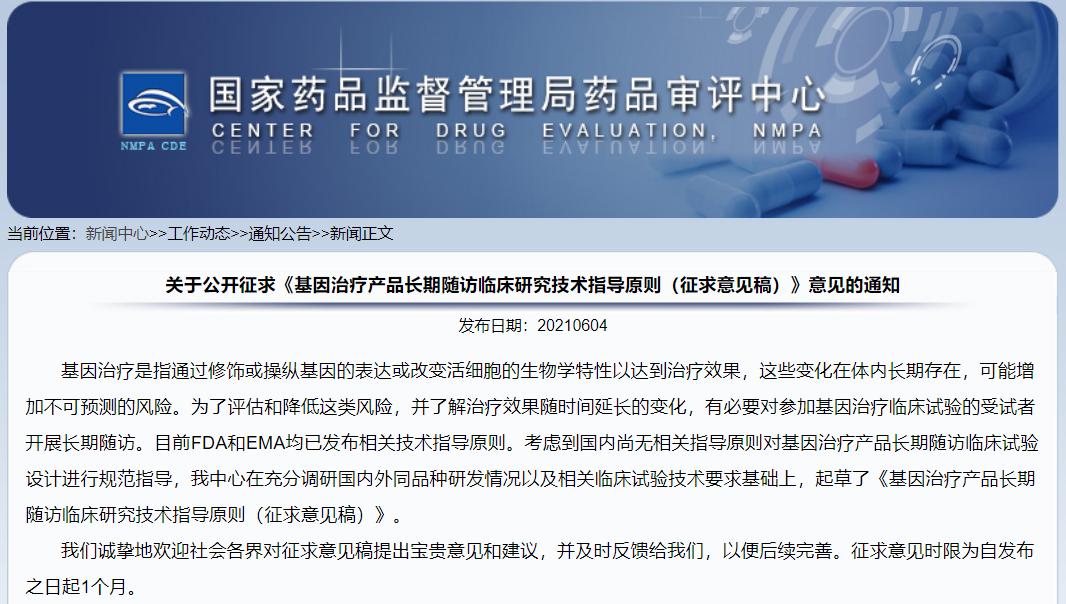 關(guān)于公開(kāi)征求《基因治療產(chǎn)品長(zhǎng)期隨訪臨床研究技術(shù)指導(dǎo)原則(征求意見(jiàn)稿)》意見(jiàn)的通知
