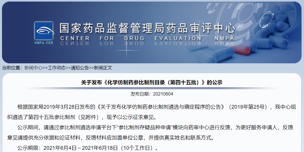 關(guān)于發(fā)布《化學(xué)仿制藥參比制劑目錄(第四十五批)》的公示
