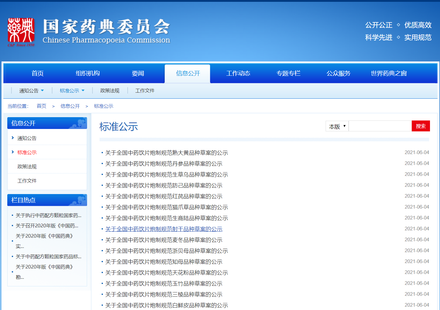 本周全國(guó)中藥飲片炮制規(guī)范熟大黃品種、全國(guó)中藥飲片炮制規(guī)范丹參品種、全國(guó)中藥飲片炮制規(guī)范生草烏品種、全國(guó)中藥飲片炮制規(guī)范防己品種、全國(guó)中藥飲片炮制規(guī)范紅芪品種、全國(guó)中藥飲片炮制規(guī)范貓爪草品種、全國(guó)中藥飲片炮制規(guī)范生商陸品種、全國(guó)中藥飲片炮制規(guī)范射干品種、全國(guó)中藥飲片炮制規(guī)范麥冬品種、全國(guó)中藥飲片炮制規(guī)范浙貝母品種、全國(guó)中藥飲片炮制規(guī)范知母品種、全國(guó)中藥飲片炮制規(guī)范天花粉品種、全國(guó)中藥飲片炮制規(guī)范玉竹品種、全國(guó)中藥飲片炮制規(guī)范三棱品種、全國(guó)中藥飲片炮制規(guī)范白鮮皮品種、全國(guó)中藥飲片炮制規(guī)范白茅根品種、全國(guó)中藥飲片炮制規(guī)范酒白芍品種、全國(guó)中藥飲片炮制規(guī)范炒白芍品種、全國(guó)中藥飲片炮制規(guī)范白芍品種、全國(guó)中藥飲片炮制規(guī)范皂角刺品種、全國(guó)中藥飲片炮制規(guī)范赤石脂品種、全國(guó)中藥飲片炮制規(guī)范肉蓯蓉品種草案公示;阿莫西林顆粒國(guó)家、碳酸鋰緩釋片、碳酸鋰片、混合核苷片、混合核苷國(guó)家藥品標(biāo)準(zhǔn)草案公示;混合脂肪酸甘油酯(硬脂)、硬脂酸鈣藥用輔料標(biāo)準(zhǔn)草案公示。