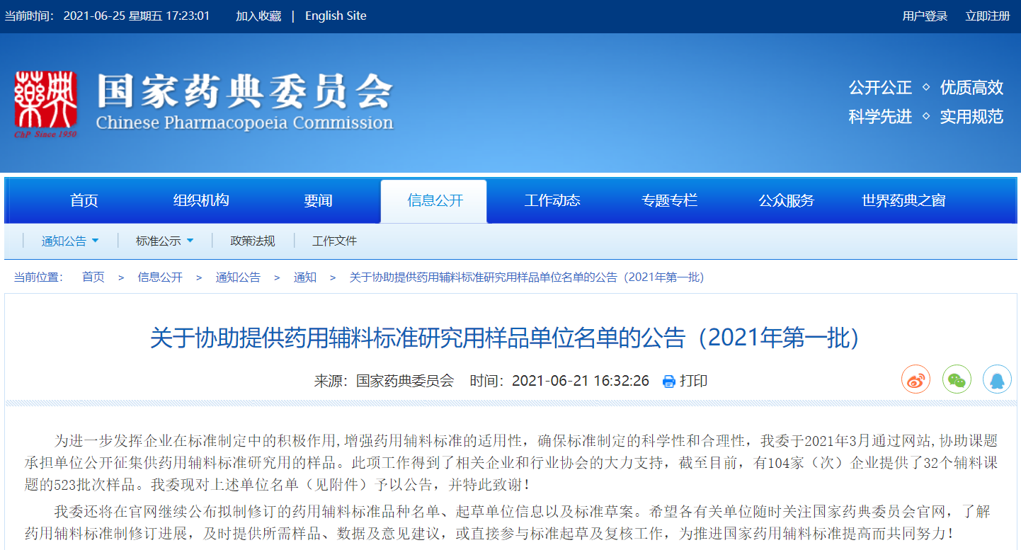 關(guān)于協(xié)助提供藥用輔料標(biāo)準(zhǔn)研究用樣品單位名單的公告(2021年第一批)