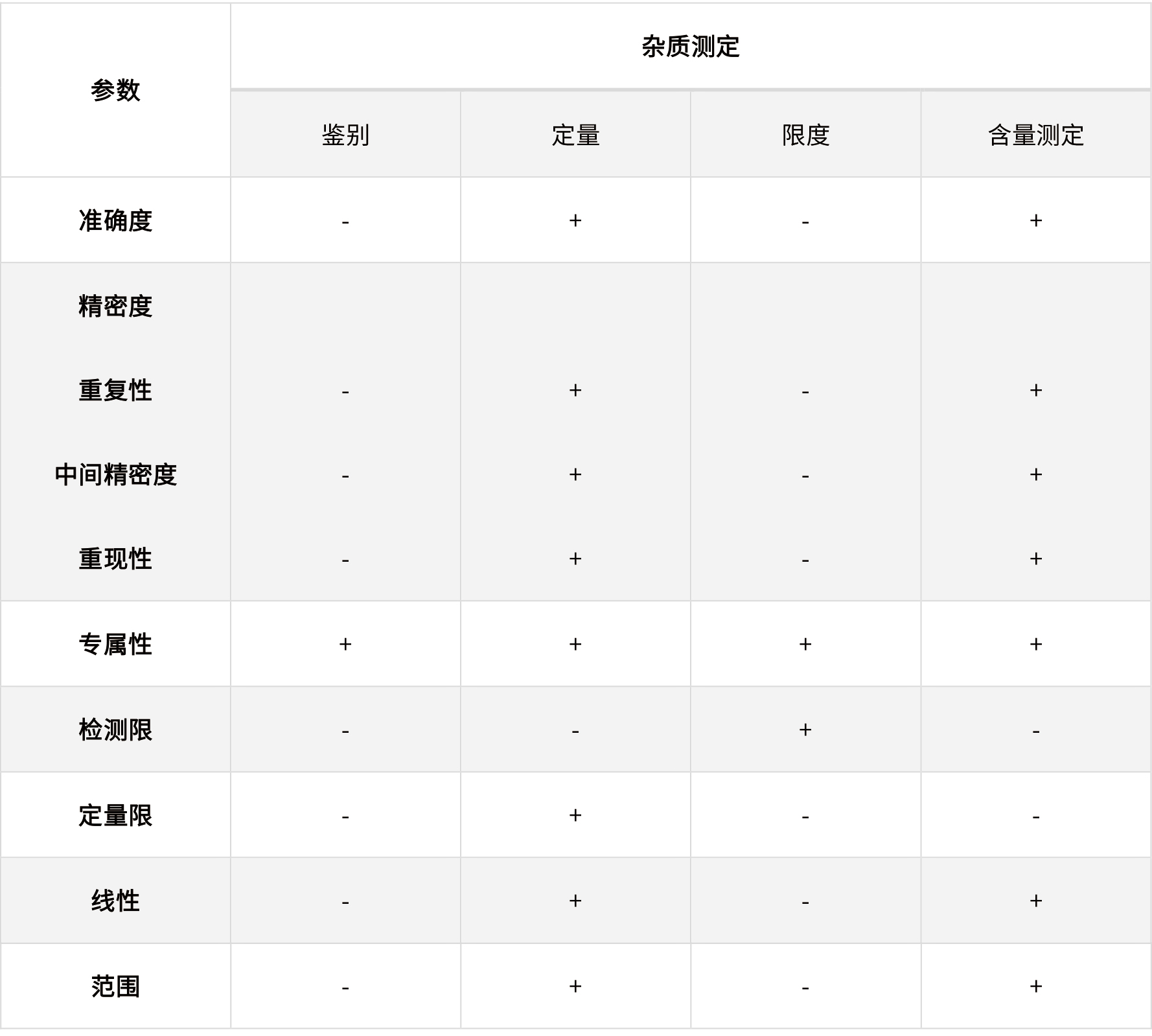 表2 ICH指導原則中規(guī)定的不同檢驗目的需要驗證的參數(shù)