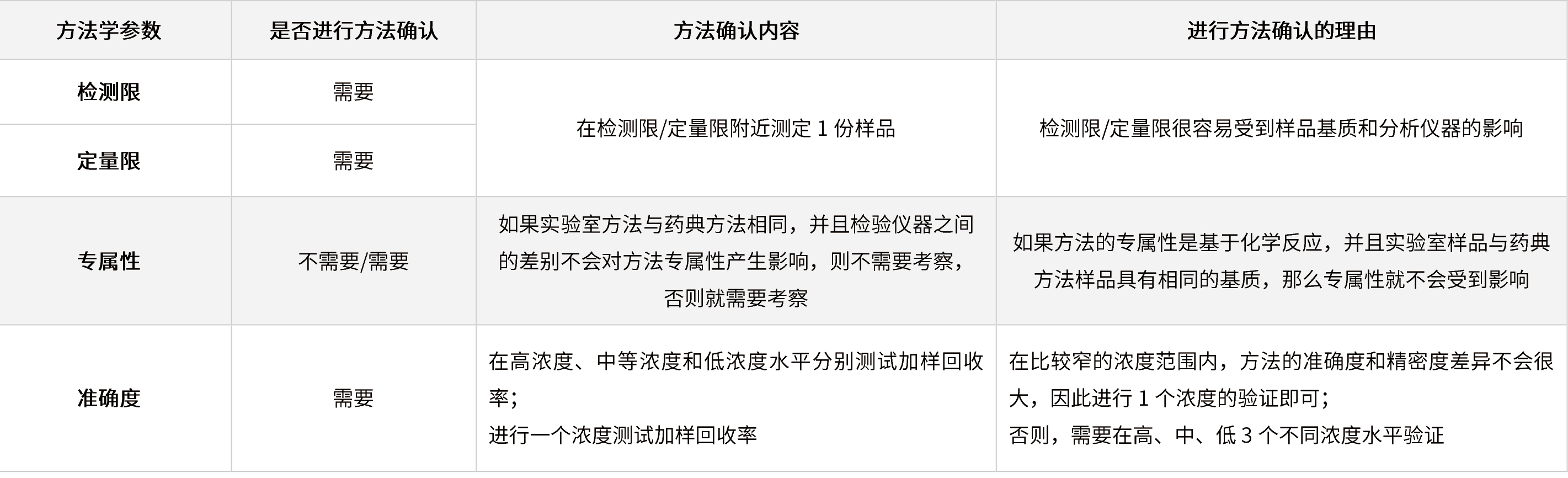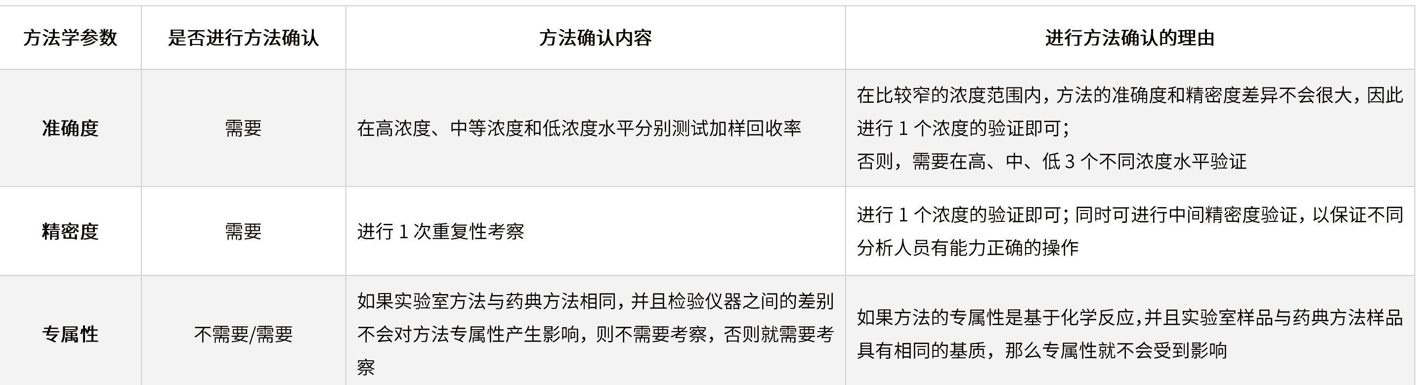 一般來說,如果沒有特別說明不適用測定某個樣品,藥典中所收載的基本檢驗方法不要求進行方法確認。這些基本檢驗方法包括:干燥失重、熾灼殘渣、重金屬、熱分析法等,以及各種濕法化學分析(比如酸值測定)和用簡單的儀器進行檢驗(如pH測定)等。