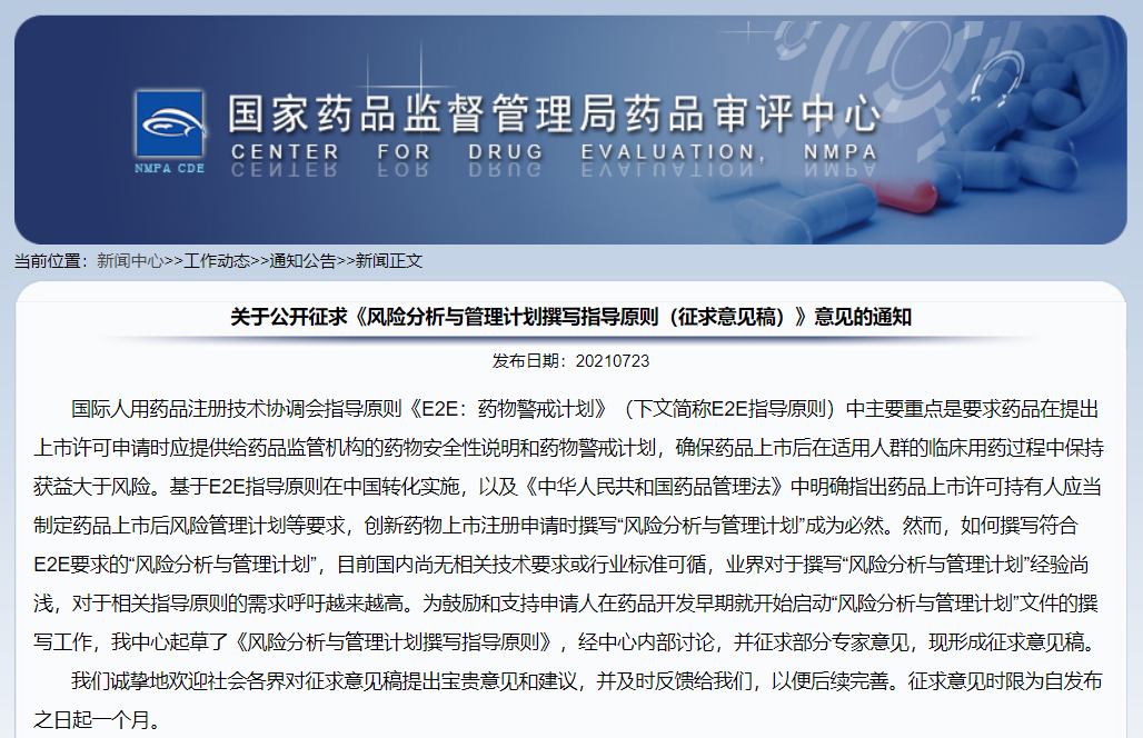 關于公開征求《風險分析與管理計劃撰寫指導原則(征求意見稿)》意見的通知