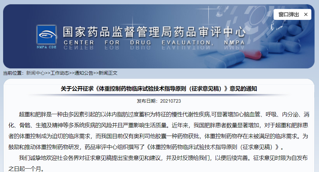 關于公開征求《體重控制藥物臨床試驗技術指導原則(征求意見稿)》意見的通知