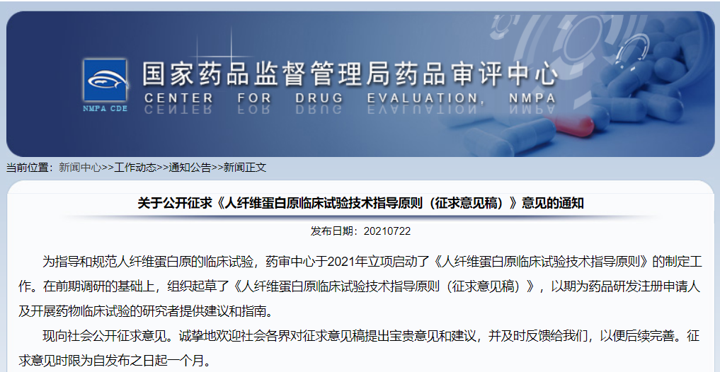 關于公開征求《人纖維蛋白原臨床試驗技術指導原則(征求意見稿)》意見的通知