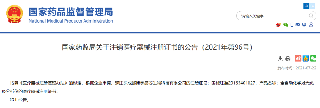 國家藥監(jiān)局關于注銷醫(yī)療器械注冊證書的公告(2021年第96號)