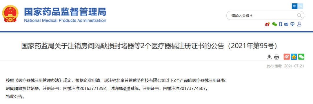 關于注銷房間隔缺損封堵器等2個醫(yī)療器械注冊證書的公告(2021年第95號)