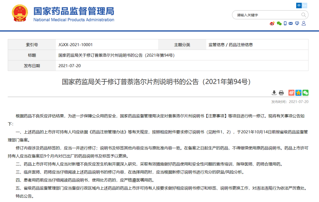 關于修訂普萘洛爾片劑說明書的公告(2021年第94號)