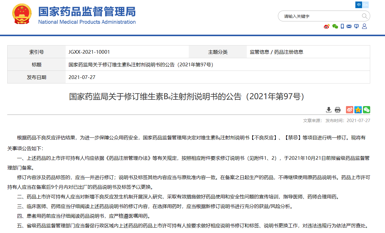 關(guān)于修訂維生素B?注射劑說明書的公告(2021年第97號)