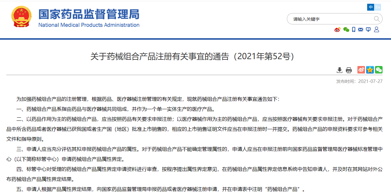 關(guān)于藥械組合產(chǎn)品注冊有關(guān)事宜的通告(2021年第52號)