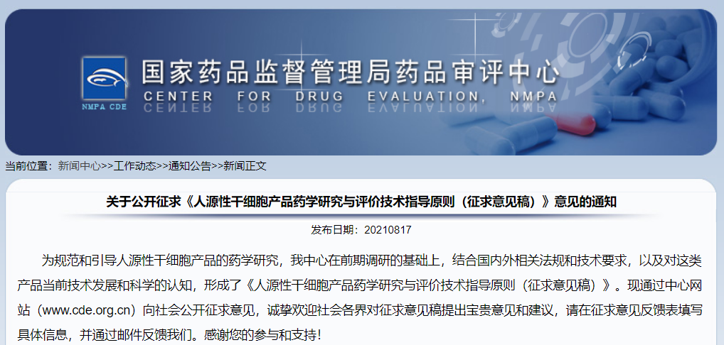 關(guān)于公開征求《人源性干細(xì)胞產(chǎn)品藥學(xué)研究與評(píng)價(jià)技術(shù)指導(dǎo)原則(征求意見稿)》意見的通知