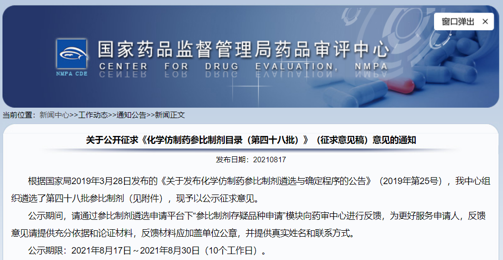 關(guān)于公開征求《化學(xué)仿制藥參比制劑目錄(第四十八批)》(征求意見稿)意見的通知