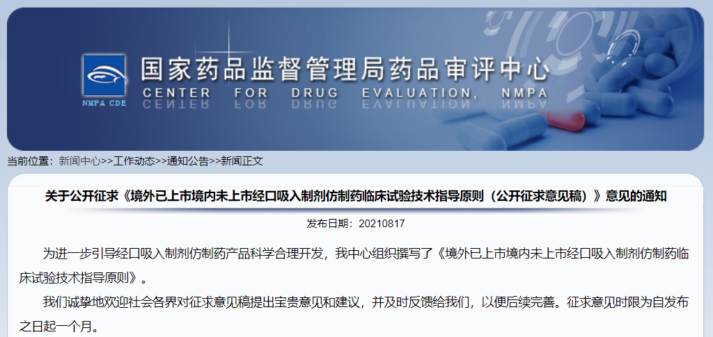關(guān)于公開征求《境外已上市境內(nèi)未上市經(jīng)口吸入制劑仿制藥臨床試驗(yàn)技術(shù)指導(dǎo)原則(公開征求意見稿)》意見的通知