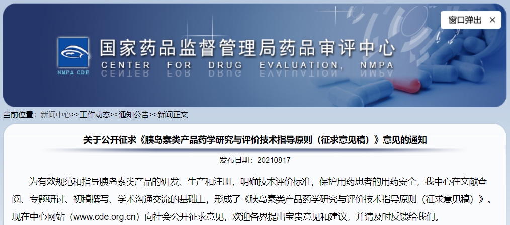 關(guān)于公開征求《胰島素類產(chǎn)品藥學(xué)研究與評(píng)價(jià)技術(shù)指導(dǎo)原則(征求意見稿)》意見的通知