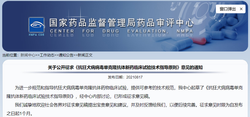關(guān)于公開征求《抗狂犬病病毒單克隆抗體新藥臨床試驗(yàn)技術(shù)指導(dǎo)原則》意見的通知