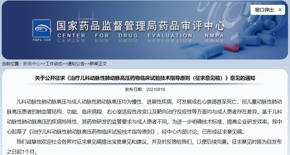 關(guān)于公開征求《治療兒科動(dòng)脈性肺動(dòng)脈高壓藥物臨床試驗(yàn)技術(shù)指導(dǎo)原則(征求意見稿)》意見的通知